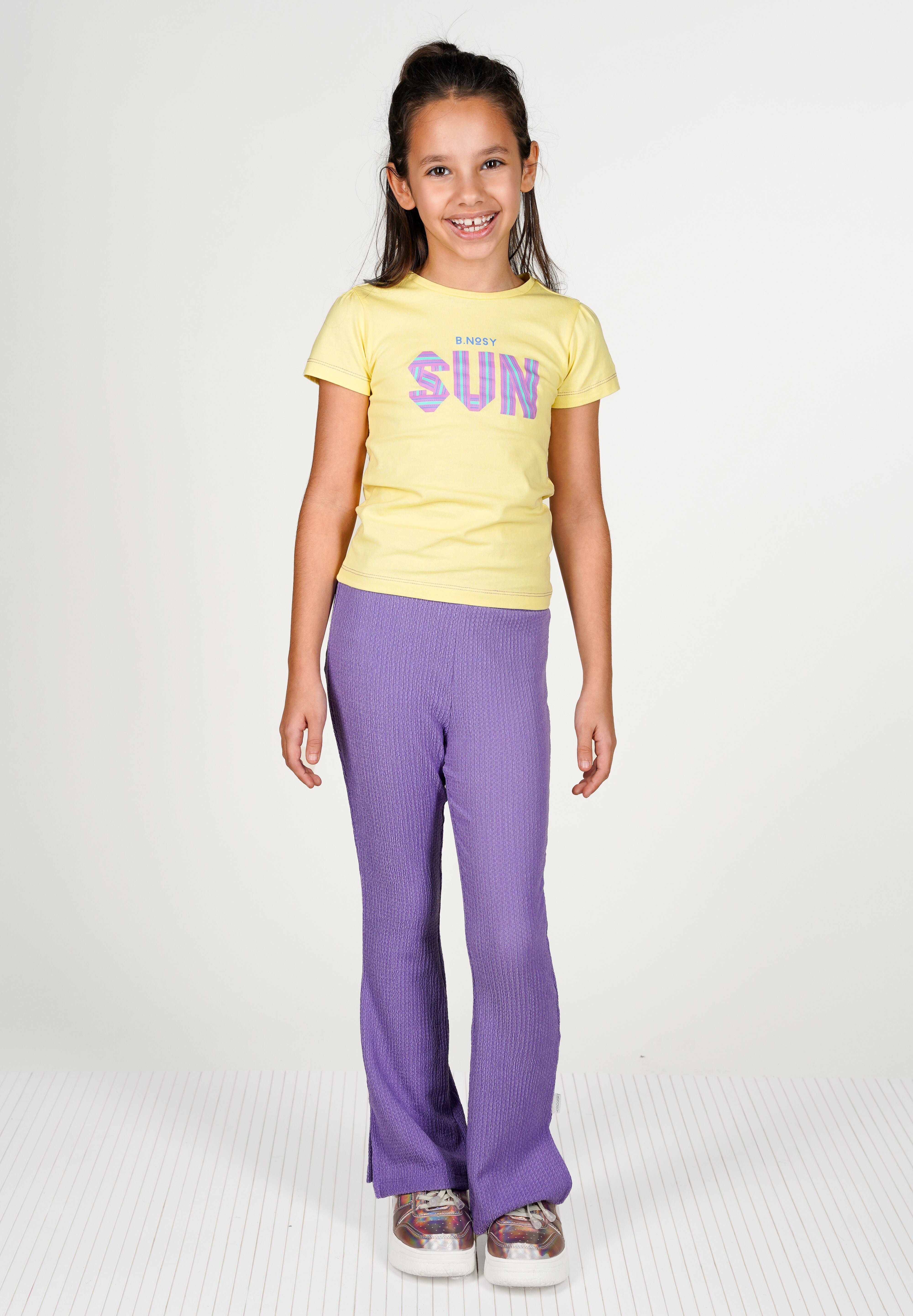 Flared pants Pammy is gemaakt van een soepele structuur stof en heeft een elastische tailleband voor ultiem comfort. De subtiele splitjes aan de onderkant geven de broek een extra touch. Combineer hem met jouw favoriete B.Nosy top voor de perfecte look! Gemaakt van gerecycled polyester en verkrijgbaar in drie kleuren.