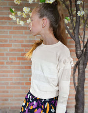 Trui Feline heeft een speciale manier van breien, helemaal uniek dus! De ecru kleur is makkelijk te combineren met de andere items uit onze collectie.