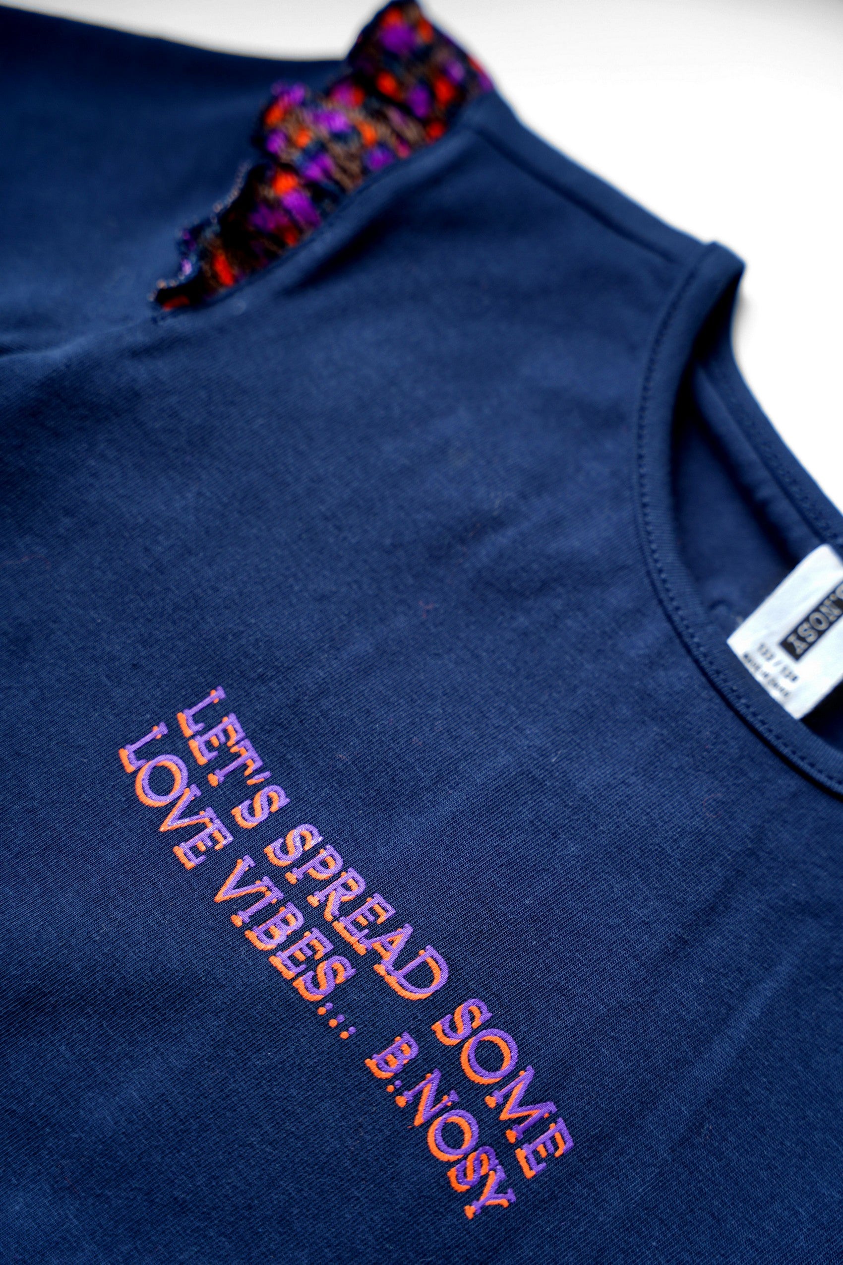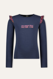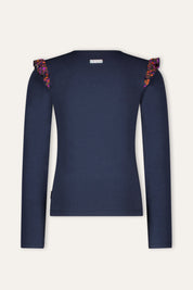 T-shirt Gigi is te gek! Dit t-shirt met lange mouwen heeft een mooie navy kleur en schattige, kleurrijke ruffels op de schouders. De paarse opdruk op dit t-shirt maakt hem super uniek!