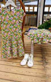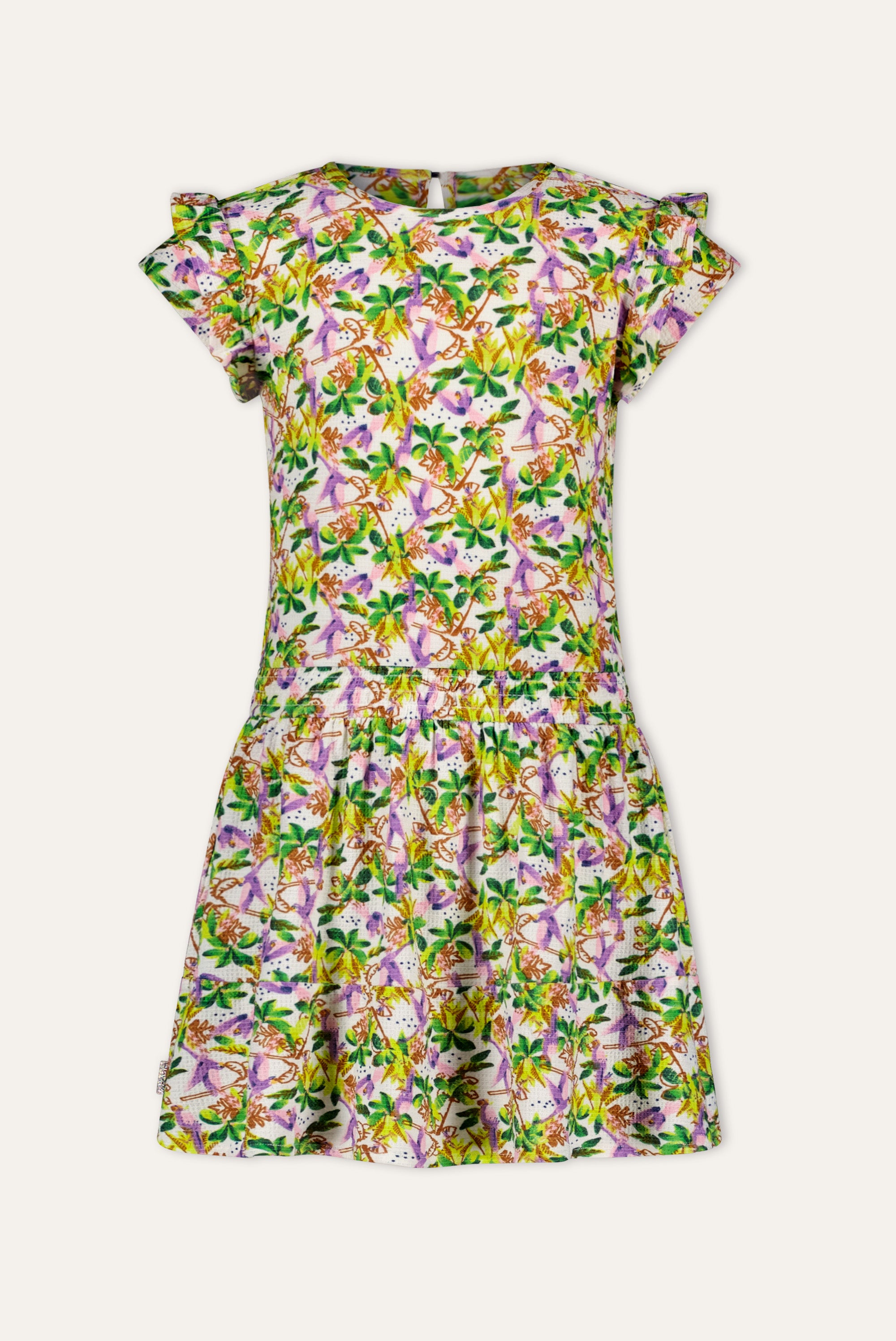 Gisele is een tropische jurk. Jouw nieuwe zomer favoriet! De jurk is gemaakt van een fijne stretchy stof en voorzien van een groen met roze frisse print met vogels. De jurk heeft ruches bij de mouwen en een elastische tailleband waardoor de rok mooi plooit. Gemaakt van recycelde materialen.