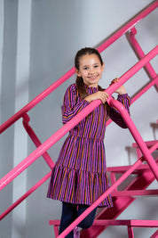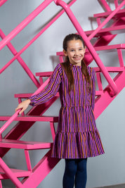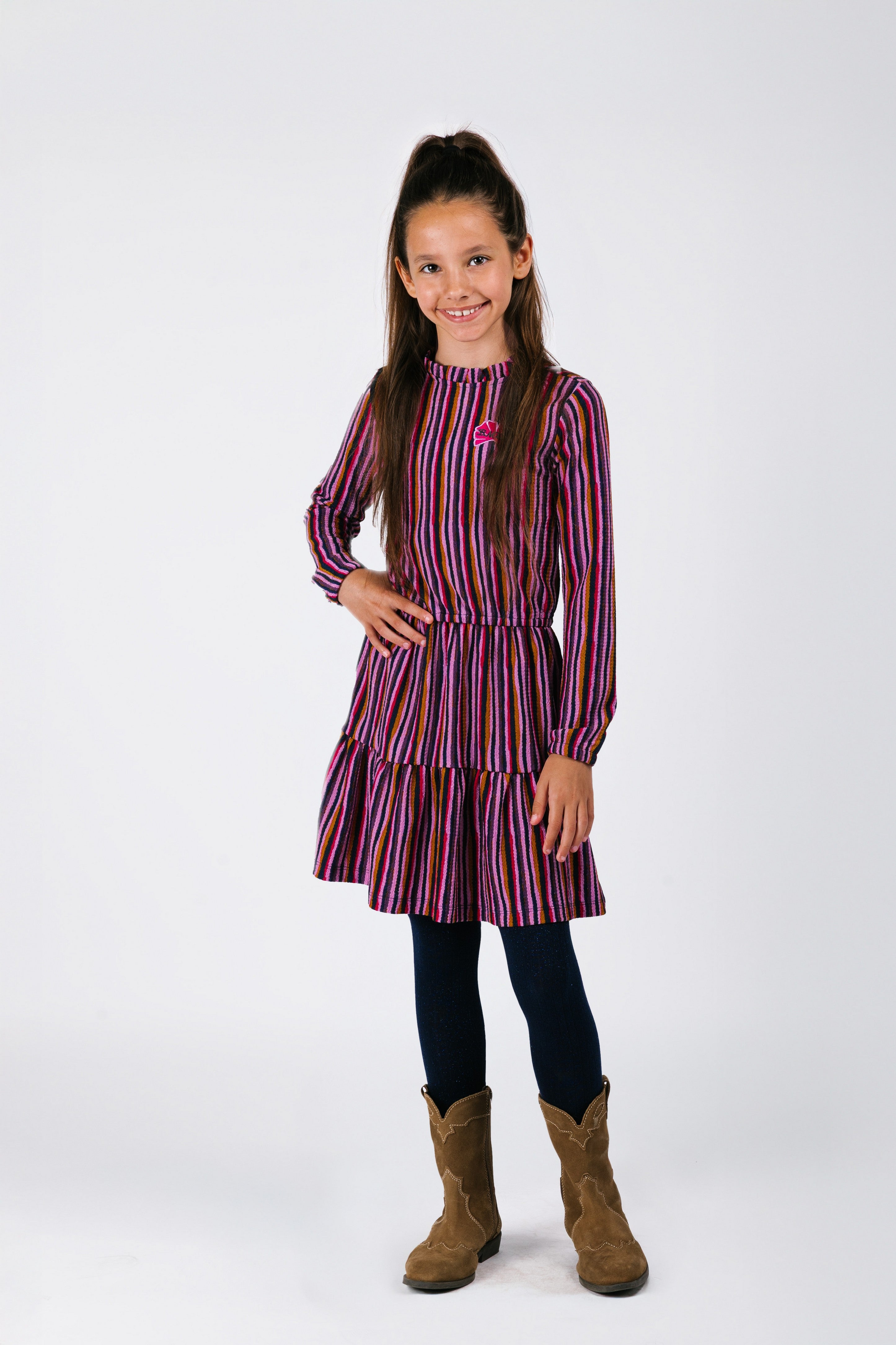 Dalia jurk van B.Nosy in kleurrijke streepprint is een leuke en comfortabele keuze voor jouw kleine meid. Gemaakt van gerecycled polyester en perfect te combineren met een legging. De jurk heeft een elastische tailleband en een schattige ruffle bij de nek, waardoor het een speelse look creëert. Deze stijlvolle jurk is ideaal voor elke gelegenheid. Scan de QR-code om de reis van het kledingstuk te ontdekken!