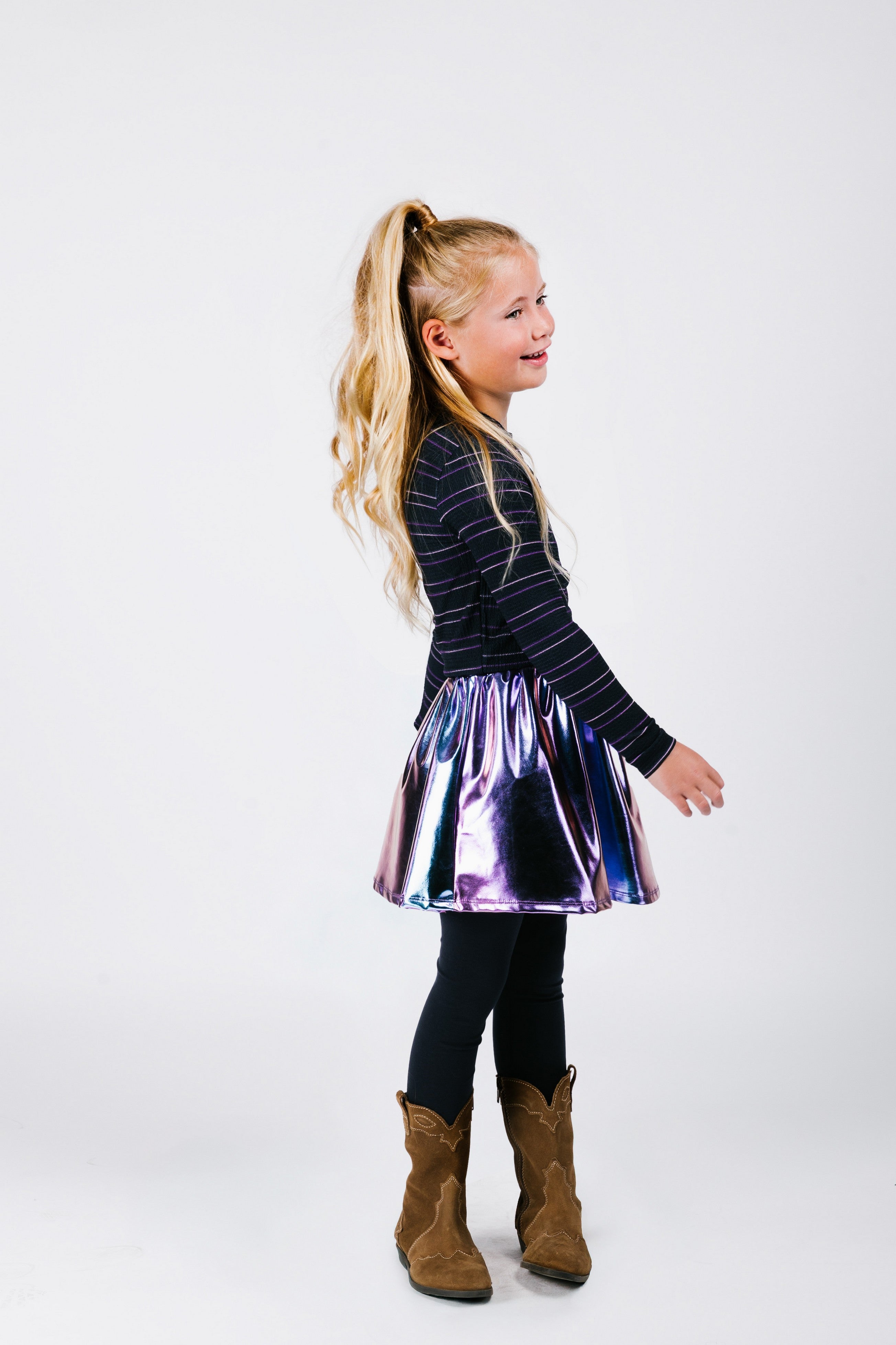 De B.Nosy Donia jurk in blauw is leuk en speels, perfect voor elke kleine meid! Deze jurk, gemaakt van gerecycled polyester, biedt heerlijk comfort en een perfecte pasvorm. Het opvallende metallic rokje maakt deze jurk extra bijzonder, ideaal voor zowel casual als feestelijke momenten. Combineer het met de Mailot Marley voor een trendy uitstraling. Scan de QR-code om de reis van het kledingstuk te ontdekken!