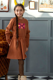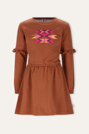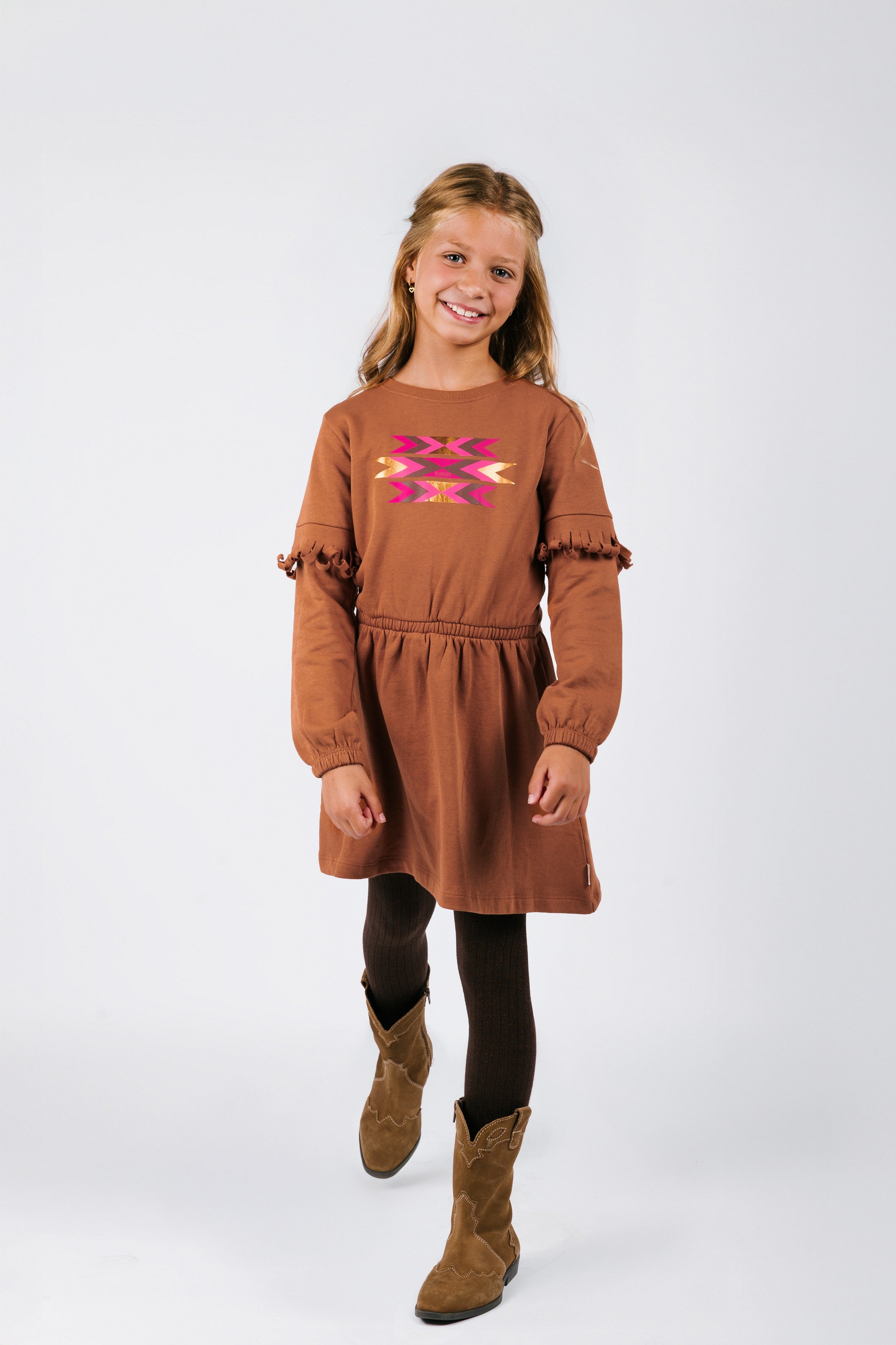 De B.Nosy Dynia jurk in bruin is perfect voor elk avontuur! Deze speelse jurk, gemaakt van biologisch katoen, biedt comfort en stijl. Met trendy franjes aan de mouwen is deze jurk een echte blikvanger. Combineer met Legging Lizzy voor een complete look. Scan de QR-code om de reis van het kledingstuk te ontdekken!