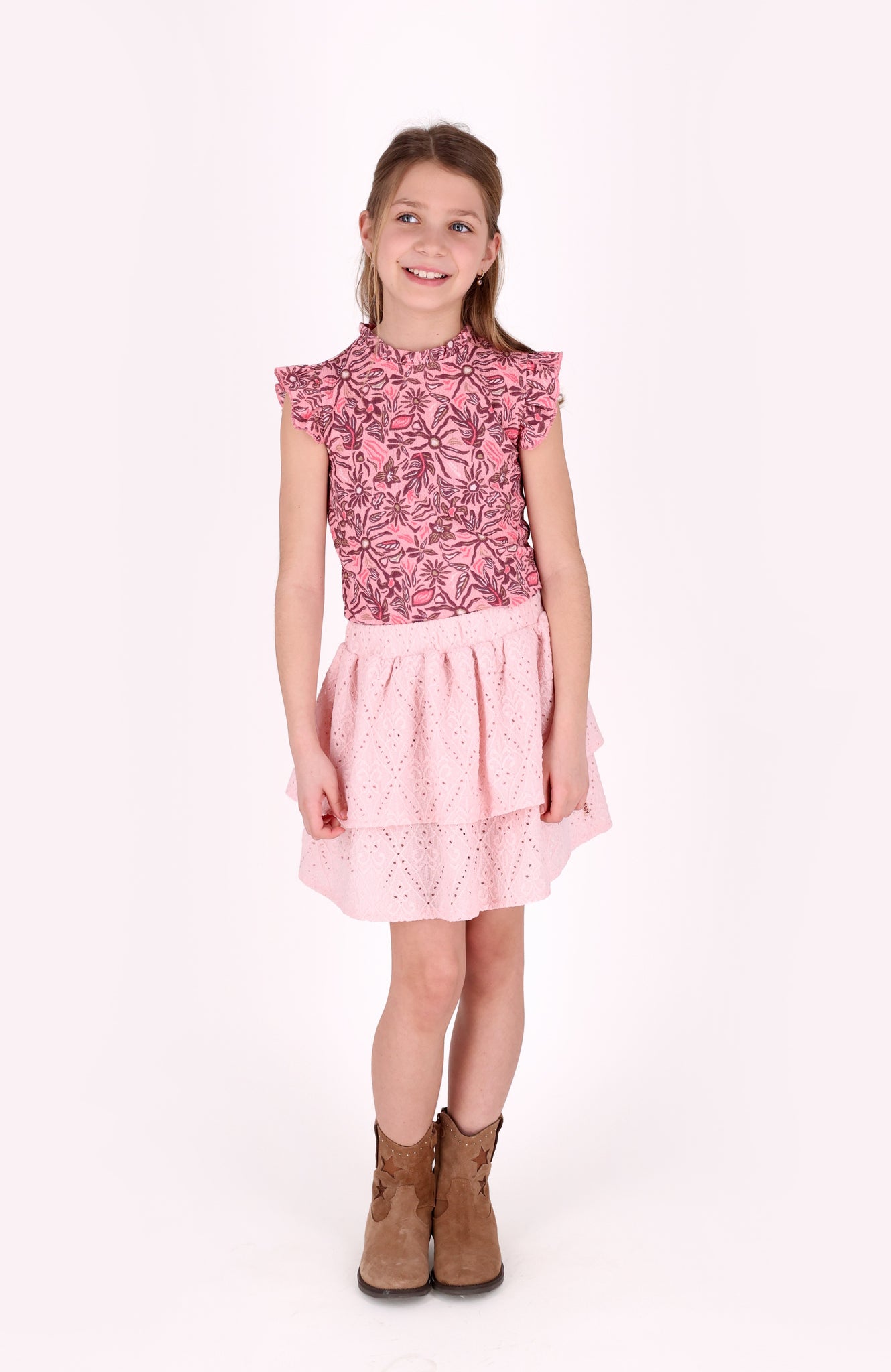 Een super toffe rok van B.Nosy voor meiden die van vrolijke mode houden! Deze rok is gemaakt van een broderie stof met rek en heeft een speelse look dankzij de twee lagen. Perfect om te combineren met een leuk T-shirt voor een complete outfit.• Trendy rok met broderie stof