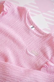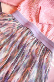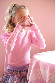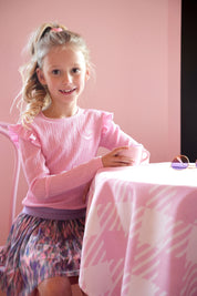 Hoe schattig is B.Nosy jurk Dia! De top is gemaakt van een zachte roze stof met subtiel glimmend effect, heeft ruffles op de schouders en leuke borduurtjes. Het meshrokje heeft een toffe alloverprint in vrolijke kleuren. Gemaakt van gerecycled polyester.