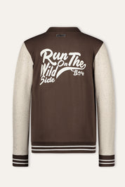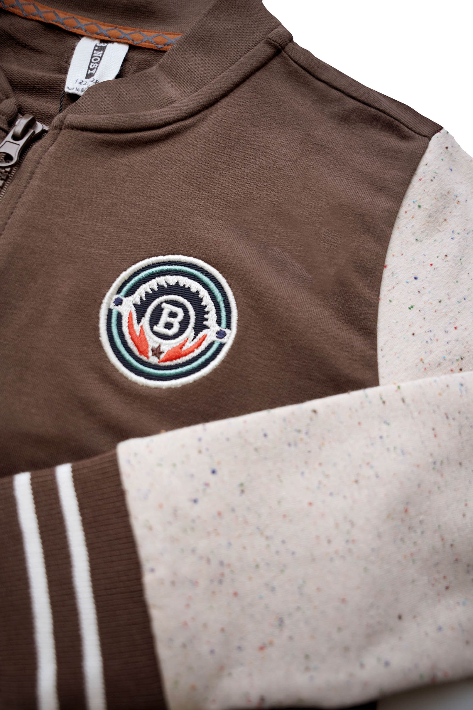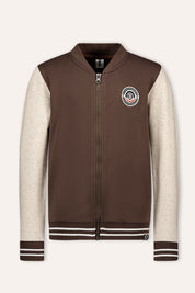 Wie cool ist diese Strickjacke! Ein echter Hingucker für Ihren Sohn! Die Strickjacke hat eine dunkelbraune Farbe mit ecrufarbenen Ärmeln. Die Weste hat coole Ränder am unteren Ende der Weste und an den Ärmeln, einen coolen Patch auf der linken Brust und ein Artwork auf der Rückseite. Diese Weste kann offen oder geschlossen getragen werden.