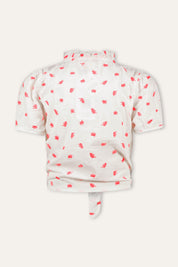 Das Evi-Top ist eine schöne, luftige Bluse. Dieses weiße Oberteil besteht aus gewebter Baumwolle mit leuchtend rosa aufgestickten Blättern. Die Bluse hat dezente Puffärmel, einen Knopfverschluss und eine Rüsche am Kragen. Der Knopf macht es komplett!