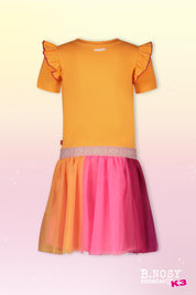 De B.Nosy x K3 Dua jurk is perfect voor een speelse uitstraling. Met de driekleurige rok en subtiele ruffels bij de mouwen is deze rok een echte eye catcher. Combineer het met haarband Ava en tasje Aqua voor een complete look!