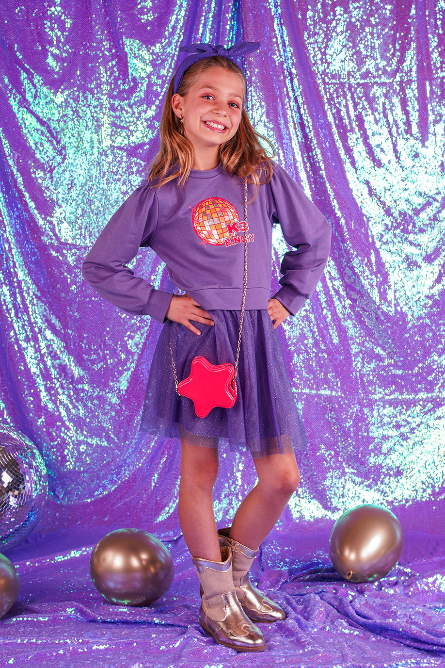 Steel de show met deze B.Nosy x K3 jurk Dasha. De jurk heeft een toffe print van een discobal met het K3 logo, en een tule ruk met glitters erop. Door de fijne sweatstof zit deze jurk heerlijk.