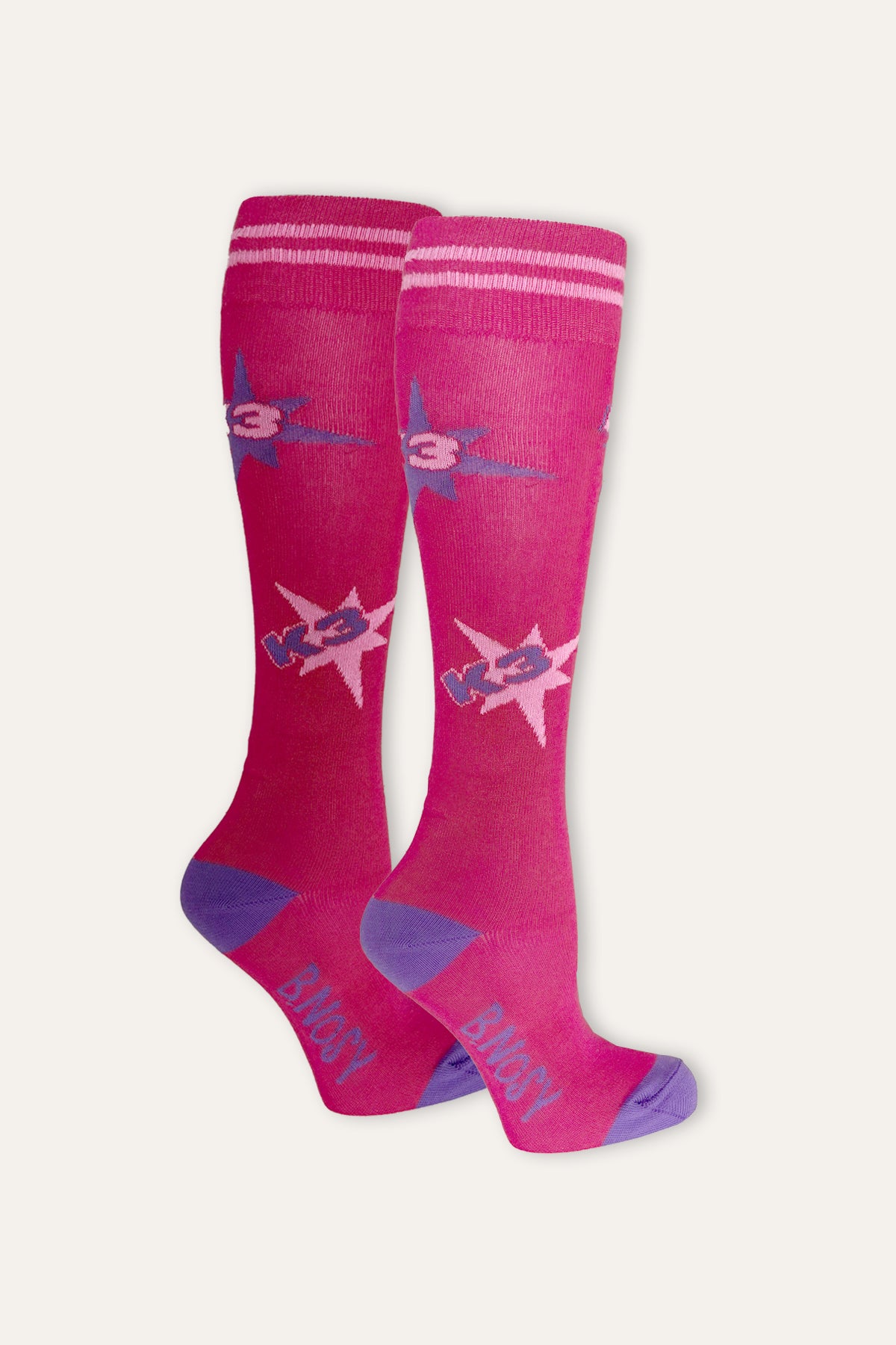 Onmisbaar bij jouw K3 outfit zijn deze te gekke B.Nosy x K3 sokken. De sokken hebben toffe ingebreide sterren en een K3 logo, en matchen perfect bij de B.nosy x K3 collectie. Een echt collectors item!