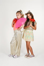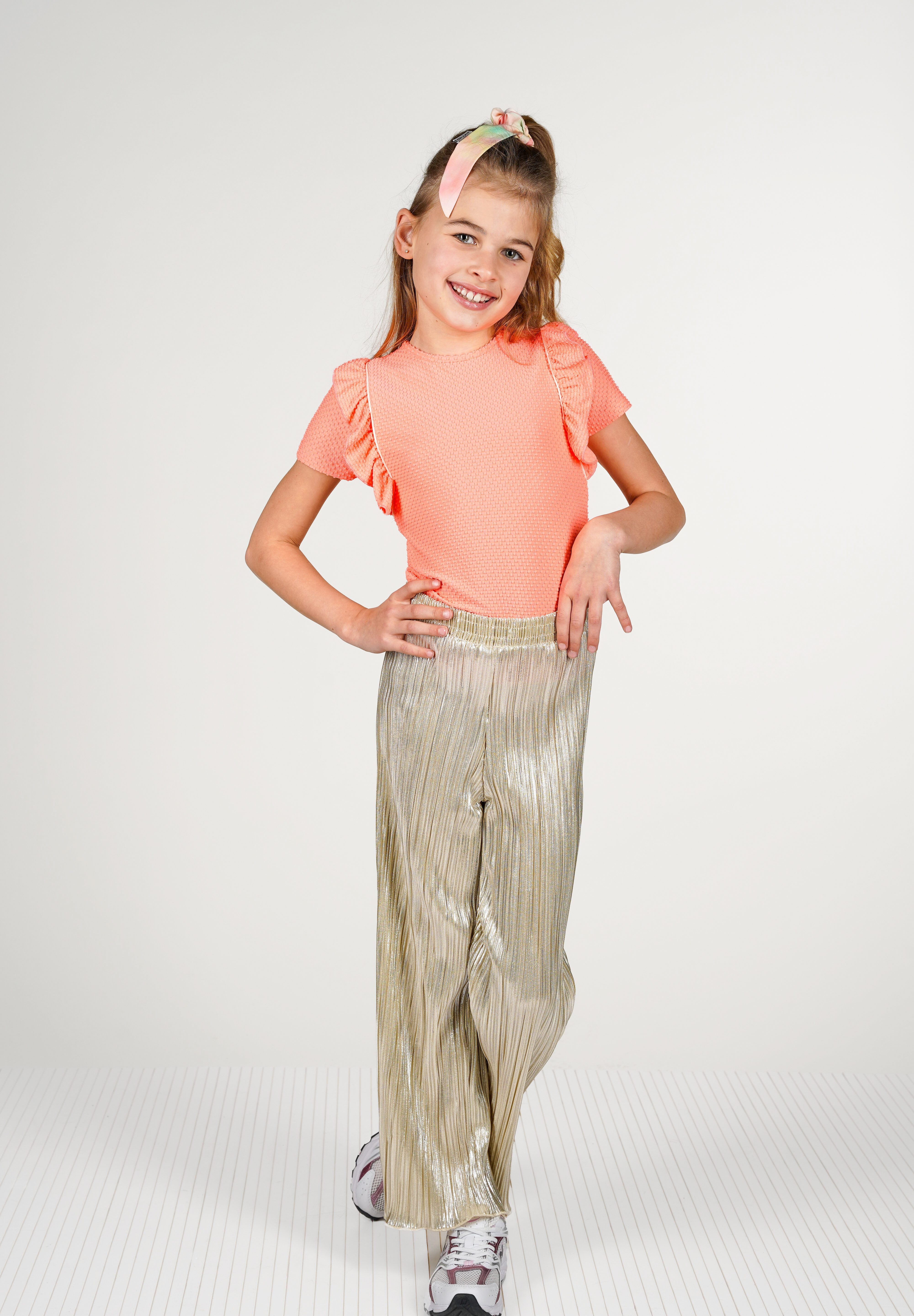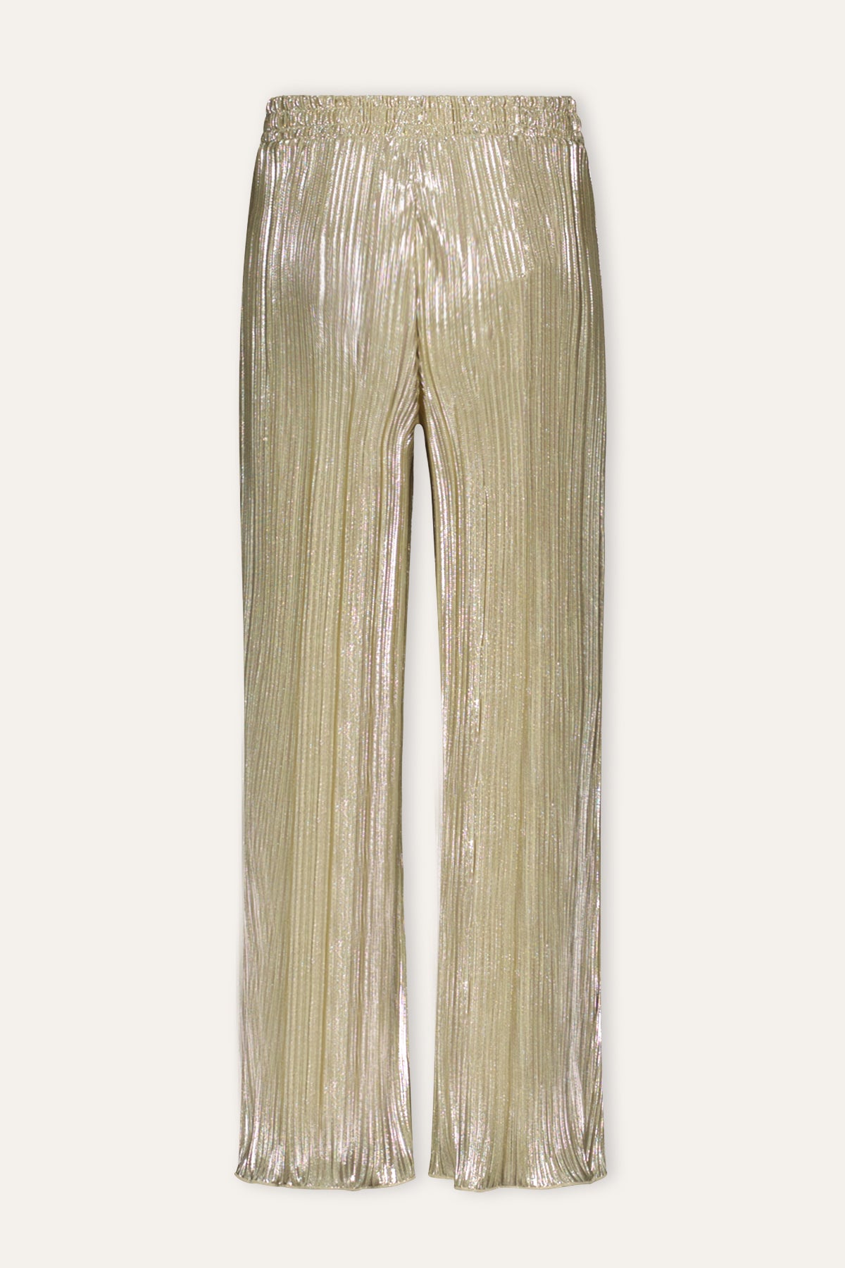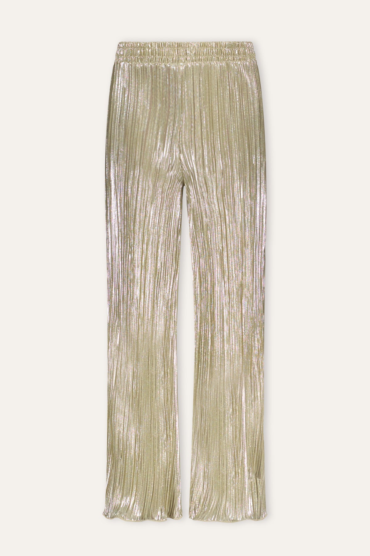 De Palomi broek is gemaakt van een glanzende plissé stof en heeft een gouden kleur. De wijdvallende pasvorm maakt de broek een echte must-have. Combineer hem met de bijpassende top Brynn of een van de andere T-shirts uit de collectie voor een complete look. Ook verkrijgbaar in roze!