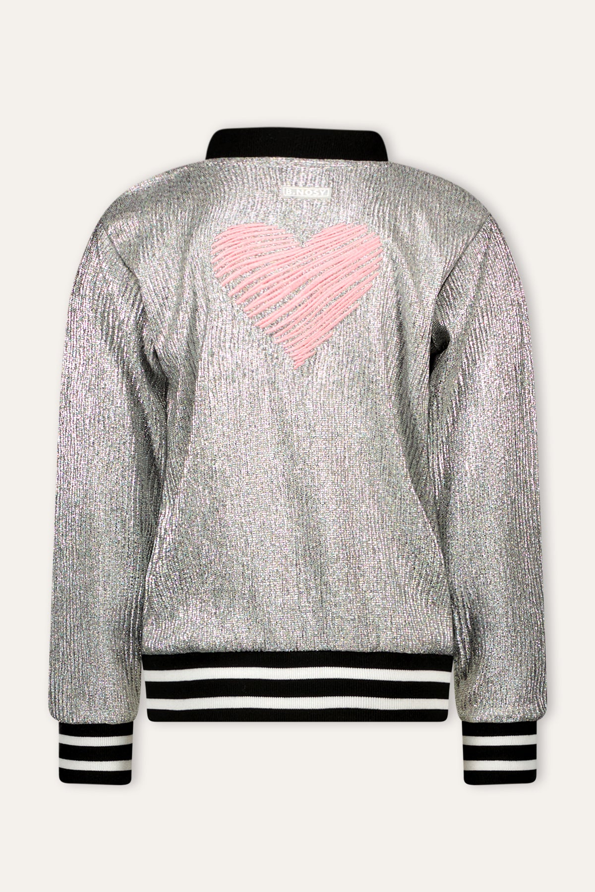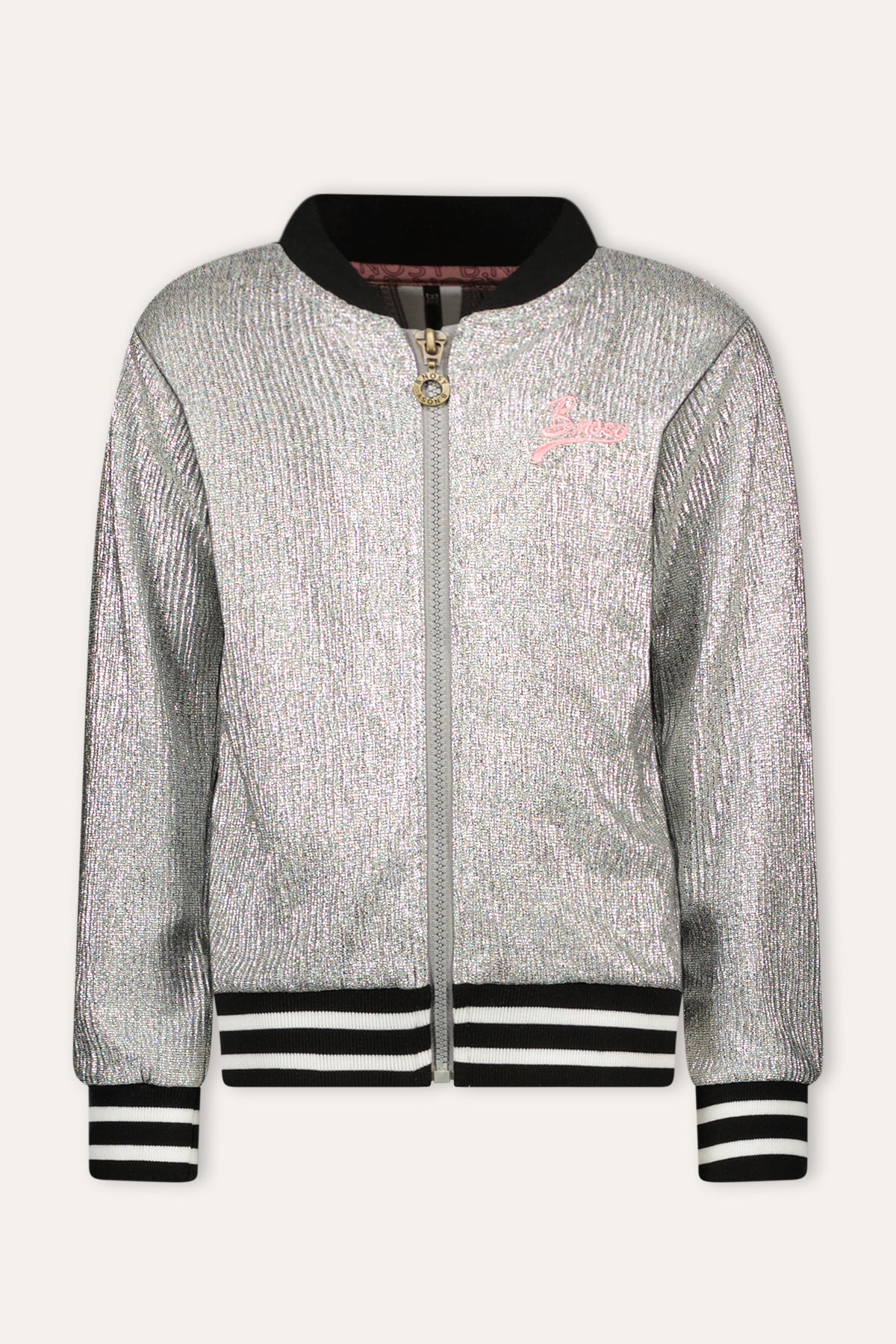 Vervollständigen Sie Ihr Outfit mit der B.Nosy Chloé Jacke. Die Jacke besteht aus einem wunderschönen strukturierten Stoff in Metallic-Silber und hat auf der Rückseite ein cooles rosa Kunstwerk. Der Halsausschnitt, der Saum und die Ärmelunterseite sind gerippt. Die Jacke lässt sich perfekt mit den Oberteilen aus der Kollektion kombinieren. Tragen Sie es zum Beispiel auf dem Tirza-Top mit Glitzer in Schwarz!