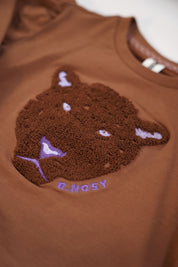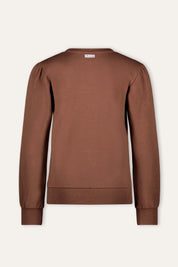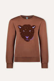 Mit dem Pullover Dina haben Sie es diesen Winter schön warm! Der Pullover hat eine schöne warme Cappuccino-Farbe und ist aus weicher CMIA-Baumwolle gefertigt. Der Pullover ist dunkelbraun mit lilafarbenem Artwork auf der Brust.