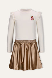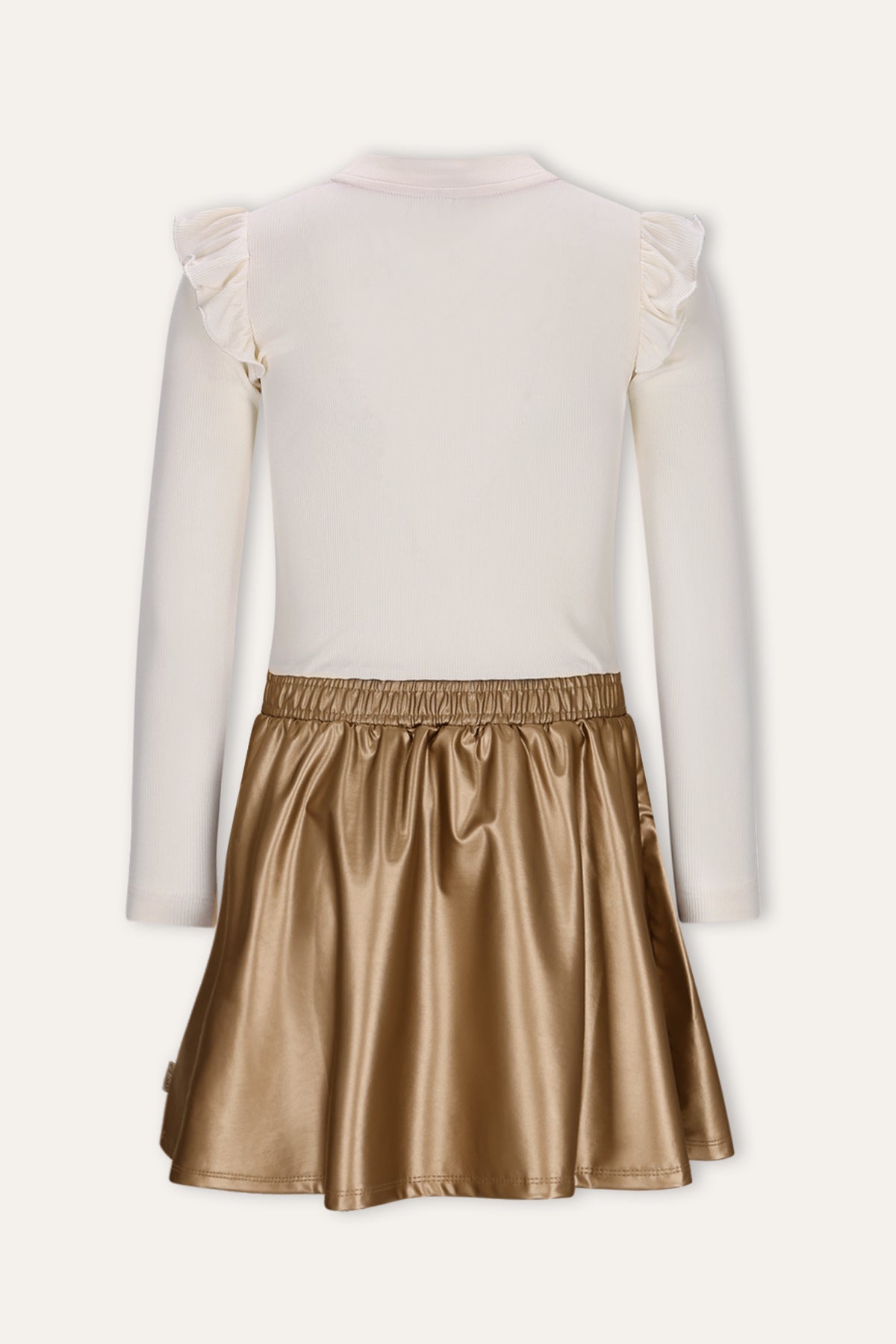 De B.Nosy Donia jurk in ecru is een speelse en comfortabele outfit voor elke gelegenheid. Gemaakt van gerecycled polyester, Hierdoor zit de jurk heerlijk. Deze jurk heeft unieke ruffles op de schouders en een prachtig metallic rokje, perfect voor een feestelijke look. Combineer met de maillot Mia voor een complete outfit. Dit is een must-have in de garderobe van elke stijlvolle meid. Scan de QR-code om de reis van het kledingstuk te ontdekken!