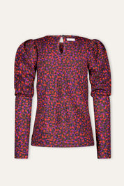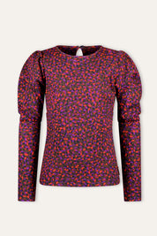 The Gina t-shirt is a super cheerful addition to your closet! The t-shirt has a playful orange with purple print and super beautiful sleeves. Comfortable and trendy, this T-shirt is an absolute must-have!