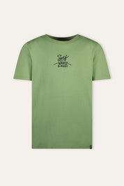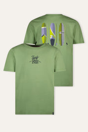 Surfs up! T-shirt Timmy in de kleur kashmir heeft een mooie groene kleur en toffe surf print op de achterzijde. Combineer met lange broek Pepe of short Paul voor een stoere look. Gemaakt van Biologisch Katoen.