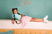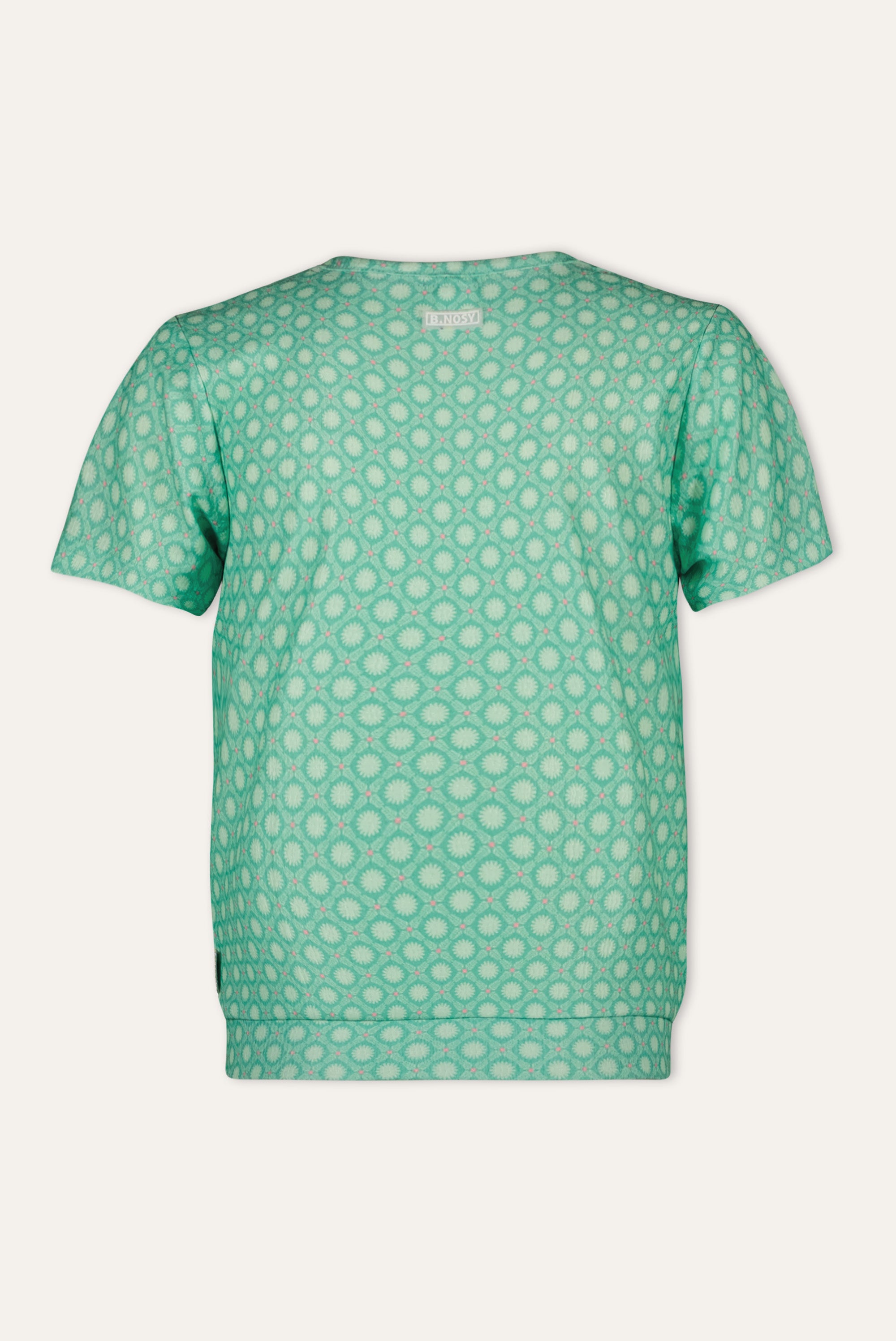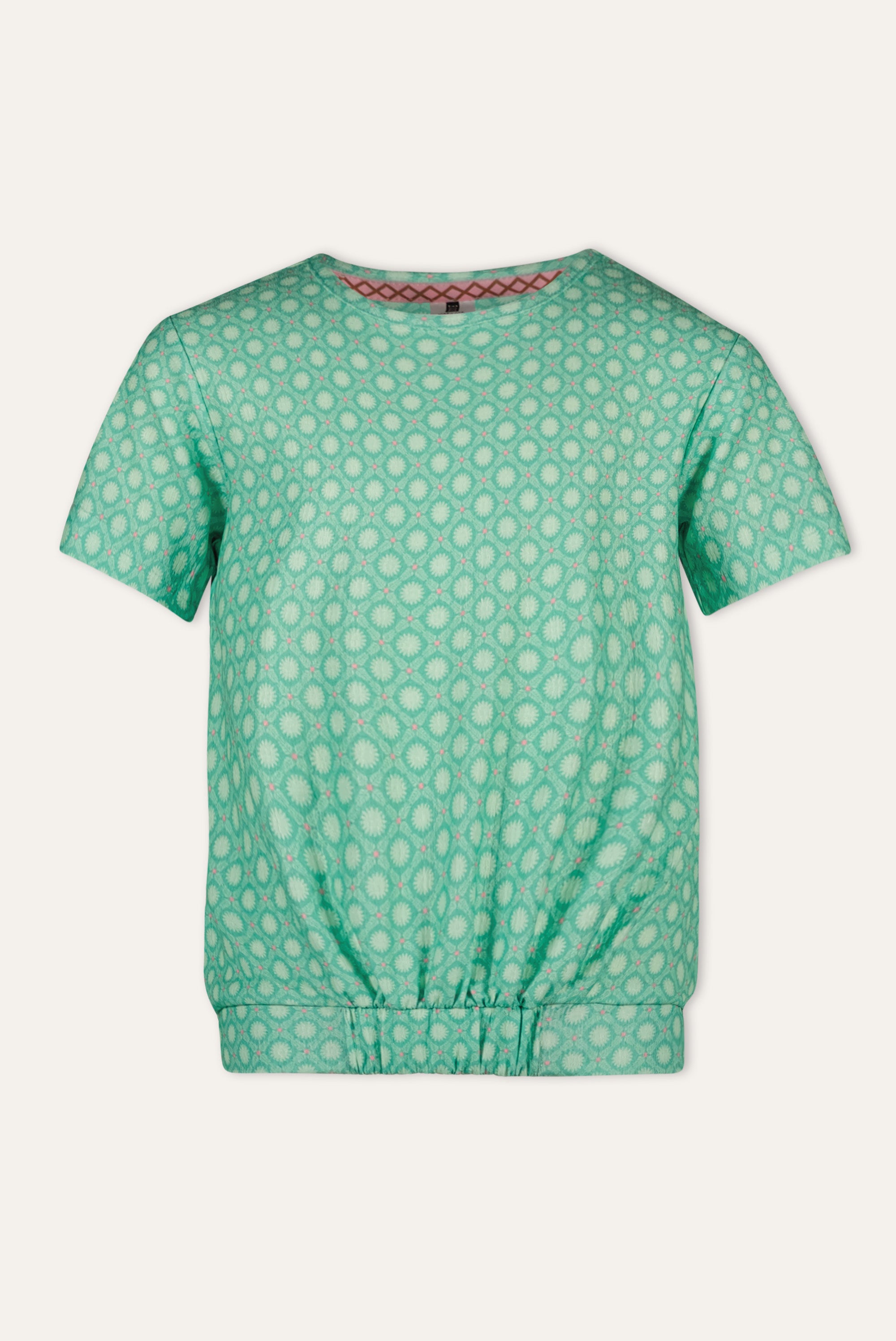 The green Emily top is made of a fine stretch fabric. The waistband features elastic, which creates a nice pleated effect! The graphic print contains a pink dot. Combine this item with a skirt for a girly look or with shorts for a cool look! Mix and match! Made from recycled materials.