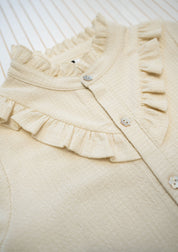 Blouse Beau is echt een pareltje! De grote ruches maken dit item een ware eyecatcher. Het is gemaakt van gerecycled polyester in een prachtige ecru kleur. De blouse draagt super comfortabel dankzij de stretch in de stof. Beau heeft een knoopsluiting en elastiek aan het uiteinde van de mouwen, waardoor de mouwen een subtiele pof hebben. Dit item is eindeloos te combineren!
