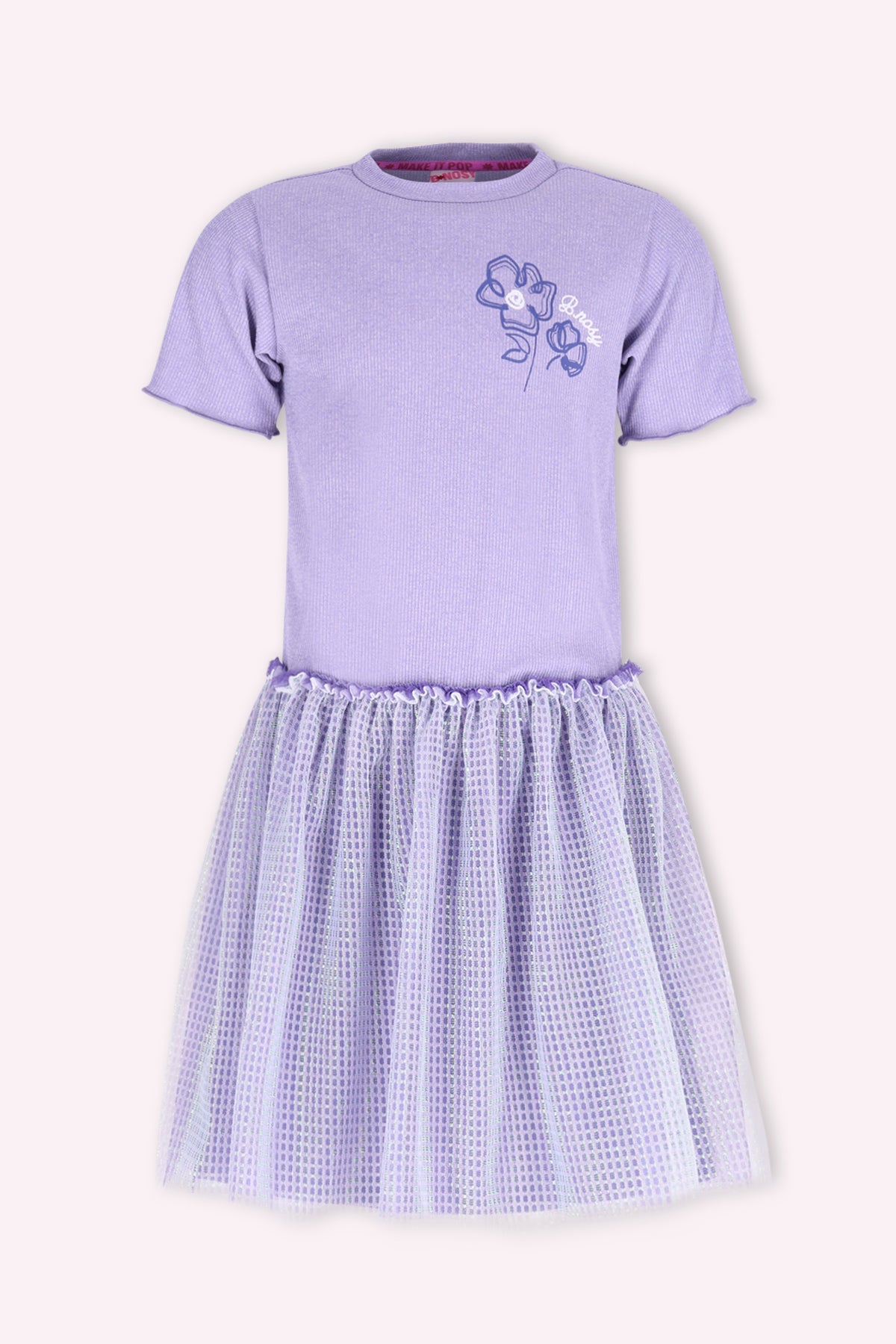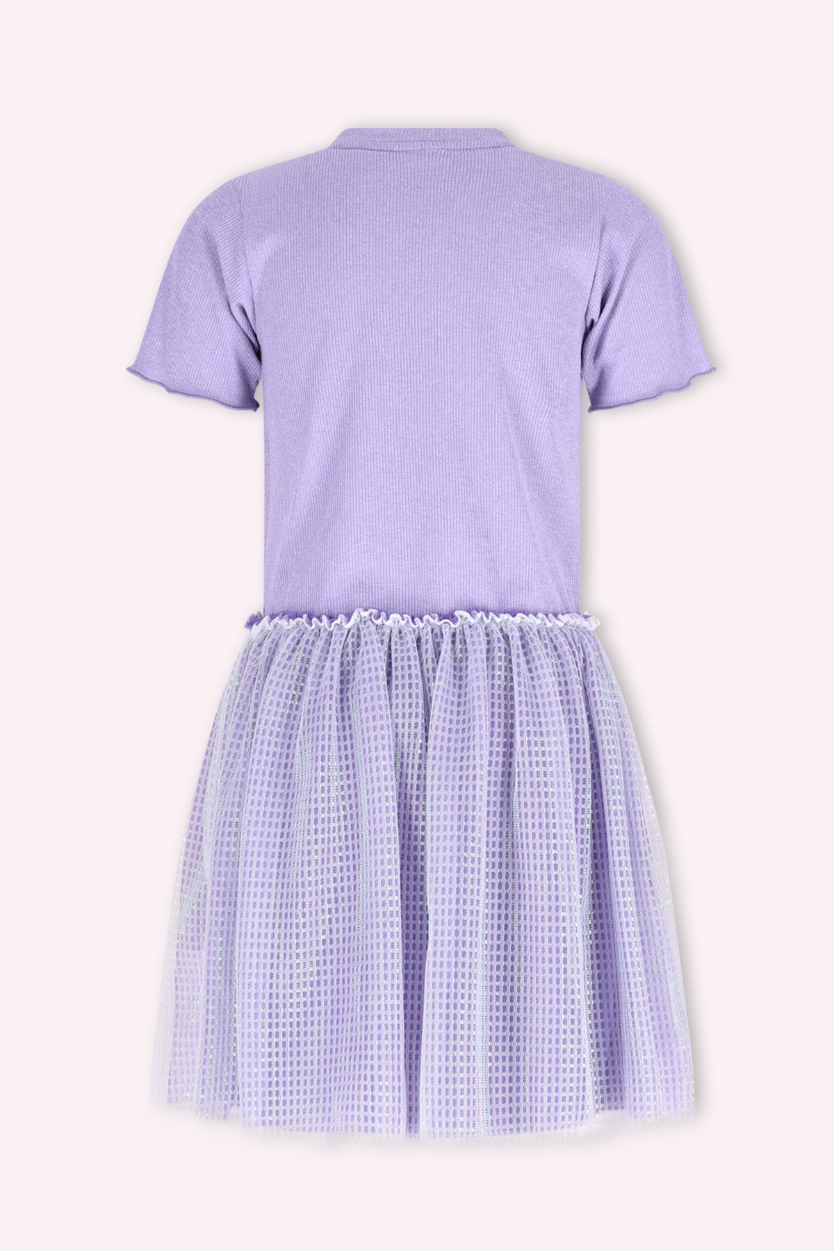 Deze speelse jurk van B.Nosy is een echte must-have voor elke meid. Het unieke design met een t-shirt bovenstuk en een rok met vallende mesh stof, verbonden door een glitterband, maakt dit jurkje super trendy. De lila kleur is een vrolijke toevoeging aan elke garderobe.