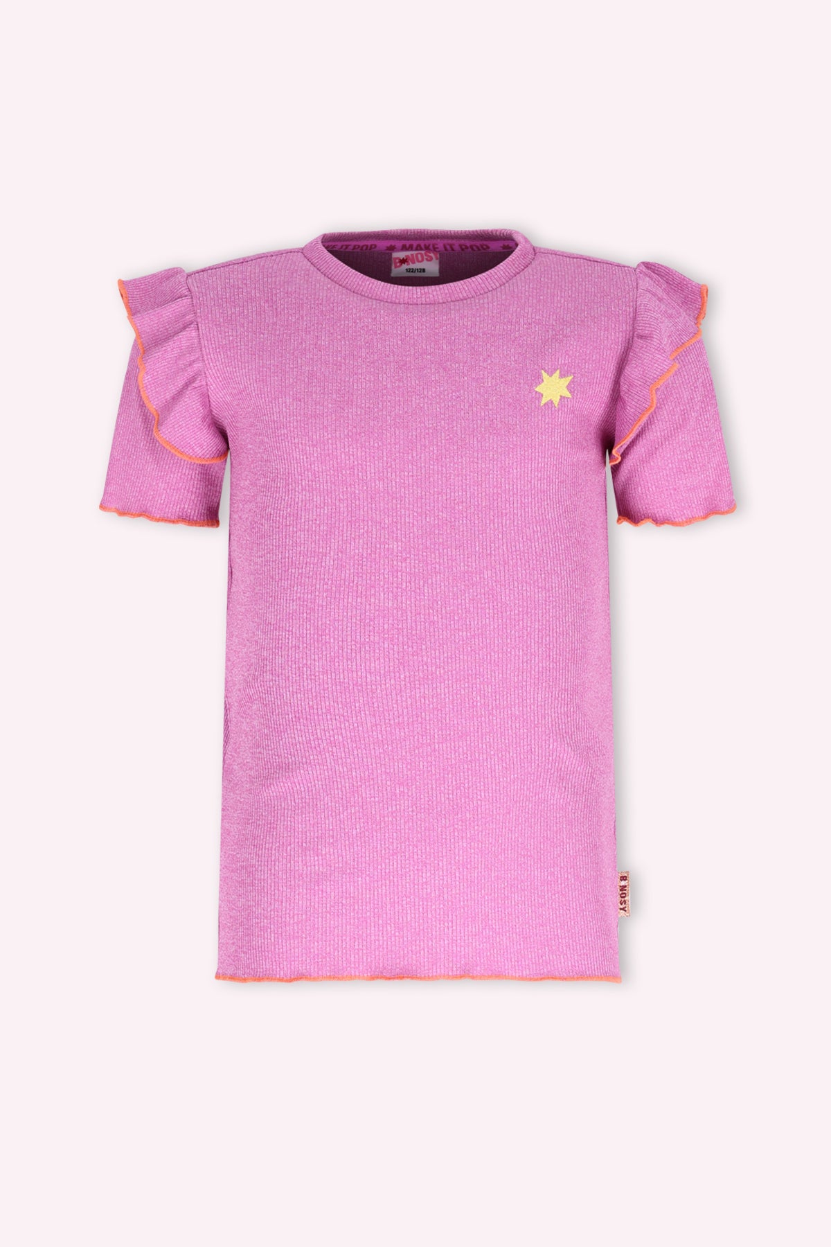 Deze toffe top van B.Nosy in een vrolijke paarse kleur is een echte must-have voor jouw meid. Gemaakt van een zachte rib stof, voelt 'ie super comfortabel aan. De roezel langs de mouw geeft het een speels detail, en het subtiele B.Nosy borduurtje op de borst maakt 'm fashionable. Perfect om te mixen en matchen met de rok Rory of broek Phoebe voor een complete outfit.